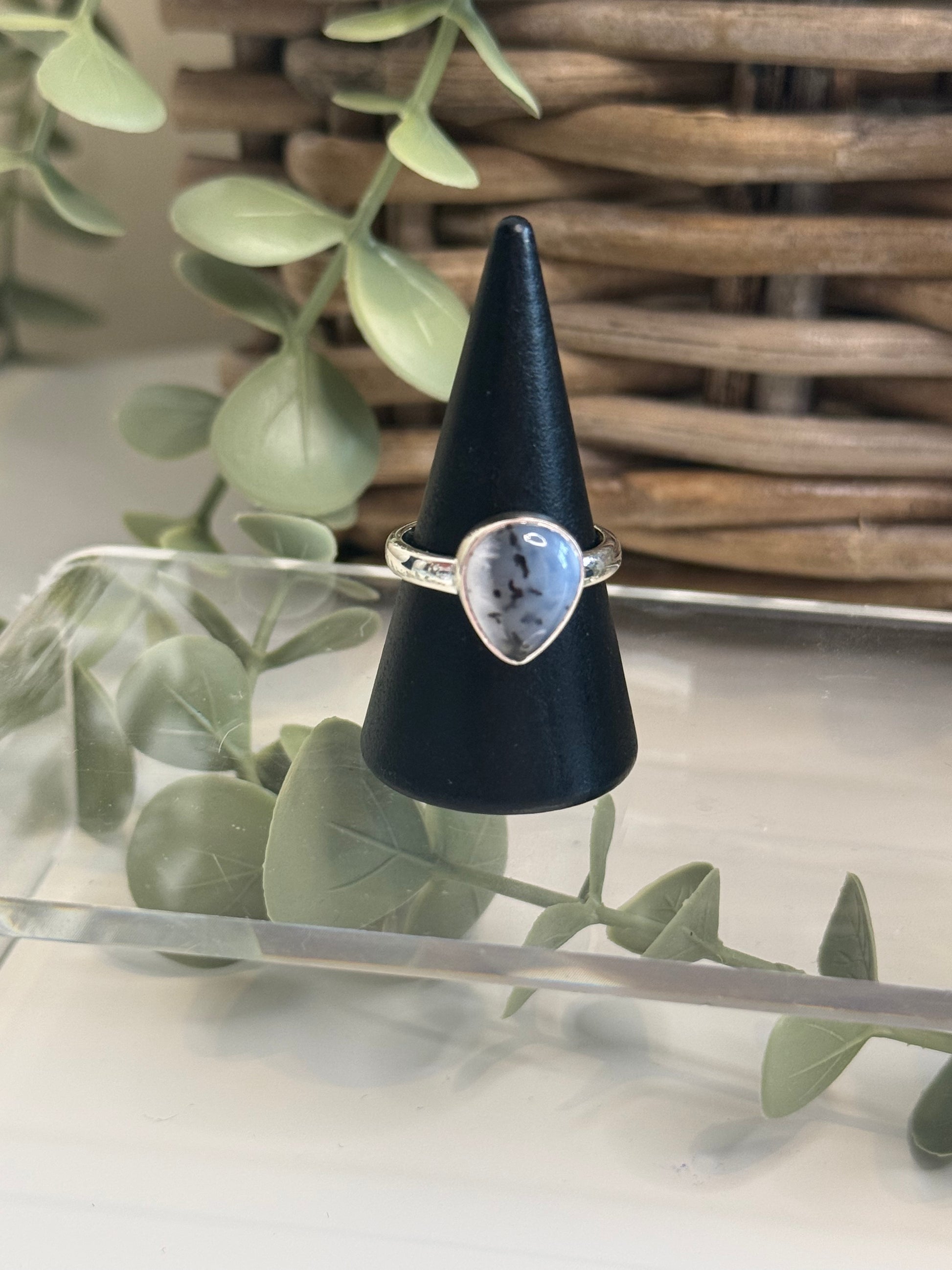 This Merlinite (also known as Dentritic Opal) ring is a powerful and unique piece that showcases the intricate patterns of the Merlinite stone.