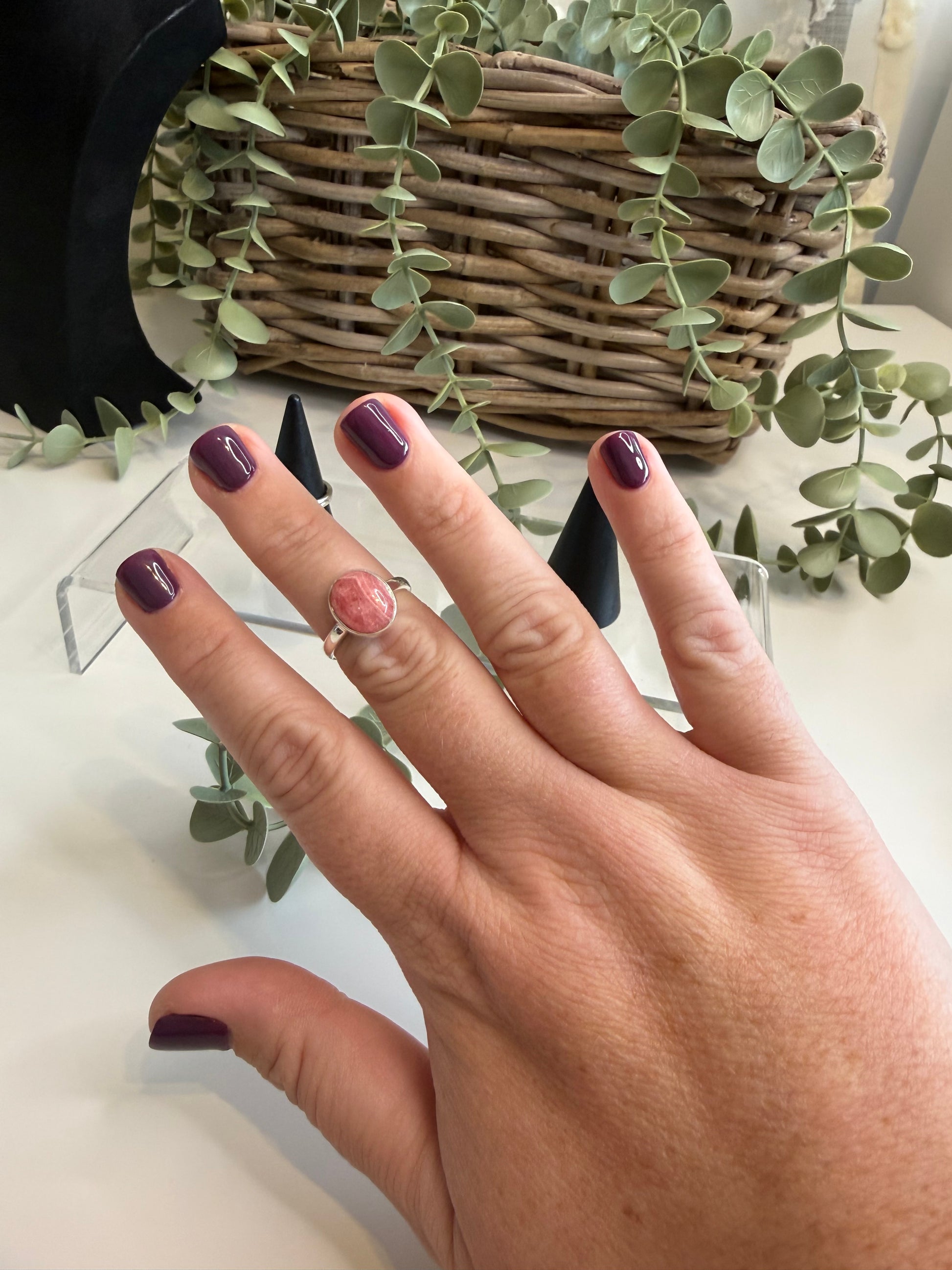 This Rhodochrosite Ring, featuring a striking oval stone, is crafted to balance emotional energy and promote self-love.